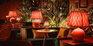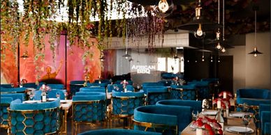 Indoor African BBQ on the 1st floor of one of London's most famous African nightclubs . With moving projection mapped wall paper the dinning experience becomes totally immersive .